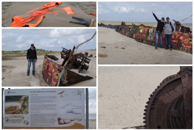 Einfach mal die Seele baumeln lassen. Lebensfreude. So machen wir den einen oder anderen Inselspaziergang. Eines unserer Ziele war das Wrack eines gestrandeten Kutters. Wir haben uns weiß Gott was vorgestellt … Einen riesigen Kutter, aber keine Walnussschale. Von diesem Standort konnte man rüber nach Borkum schauen. Der Weg dorthin war schon eine kleine Tortur. Kleine Bäche mussten ohne nasse Füße überquert werden.