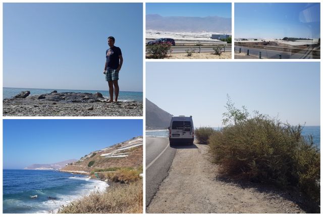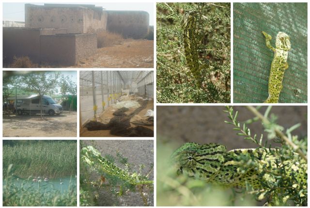 Von oben gesehen, ein weiß abgedecktes Gewächshaus neben dem anderen. Riesige Flächen sind damit bedeckt. Daher mein erster Eindruck für diese Gegend: gar nicht schön. Der Weg zum Strand dauert auf dem offiziellen Fußweg ca. 59 Minuten, dem inoffiziellen Weg 16 Minuten querfeldein durch Müllhalde, verlassene Gewächshäuser und einen nicht ausgeschilderten Weg Richtung Strand. Allerdings ein Chamäleon habe ich entdecken können.