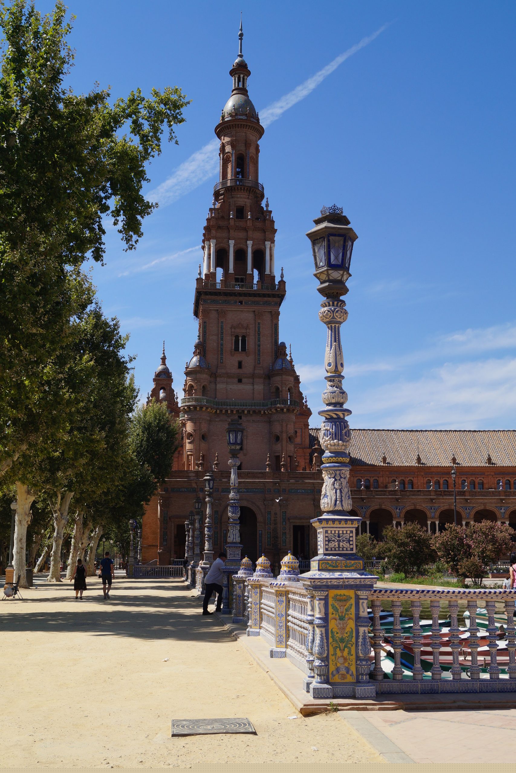 Hier am Platz steht ein Gebäude aus einer früheren Weltausstellung, was ziemlich beeindruckend ist. Einen riesigen Komplex, halbrundes Gebäude mit Wassergraben und gekachelten Brücken. Im Graben konnten Besucher mit einem kleinen Boot umher paddeln. Auf dem Innenhof ein großes Wasserbecken mit einer Wasserfontäne drumherum galoppieren die Kutschen-Betreiber ihre Besucher. Der ideale Platz für schöne Bilder.